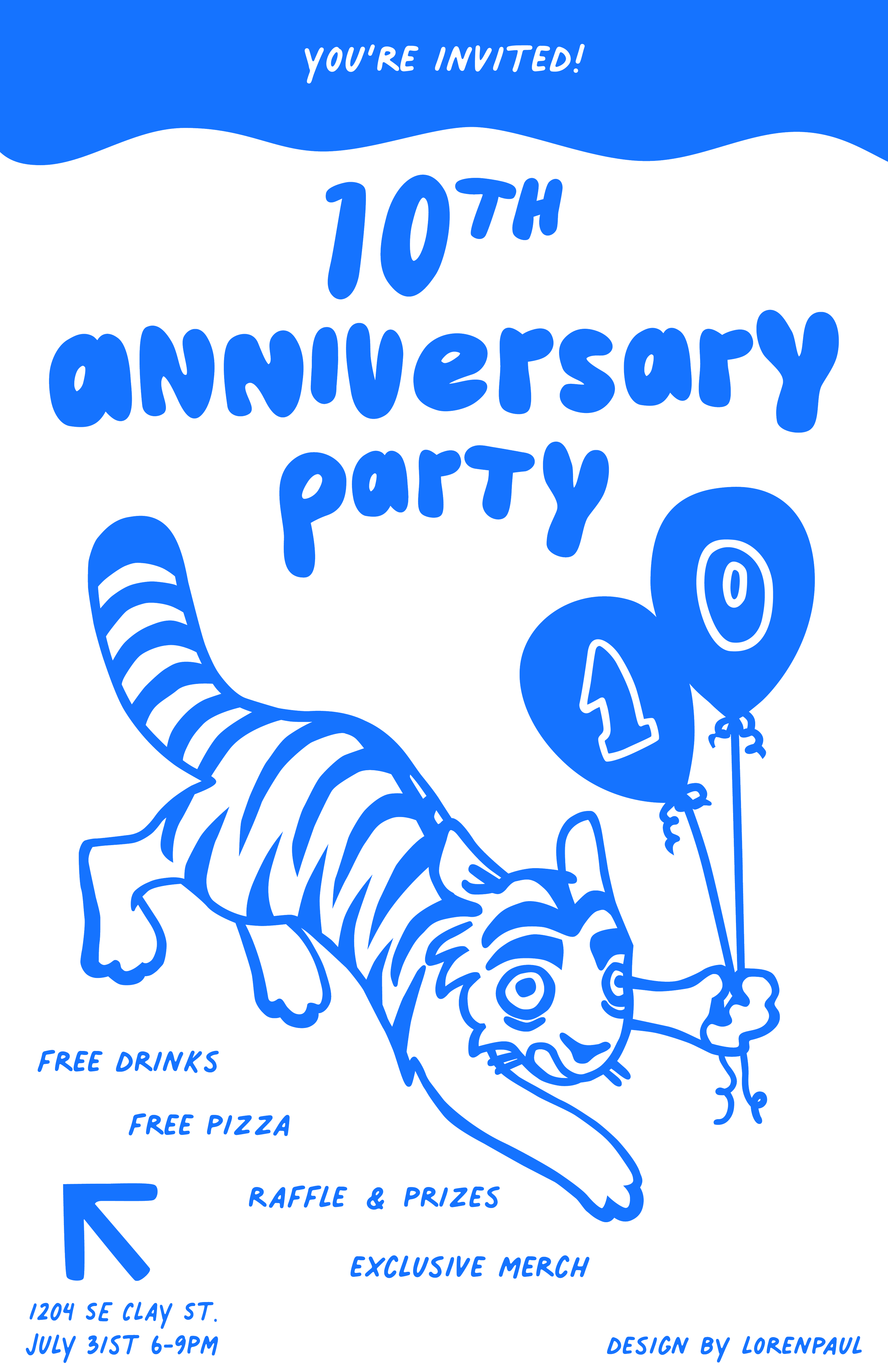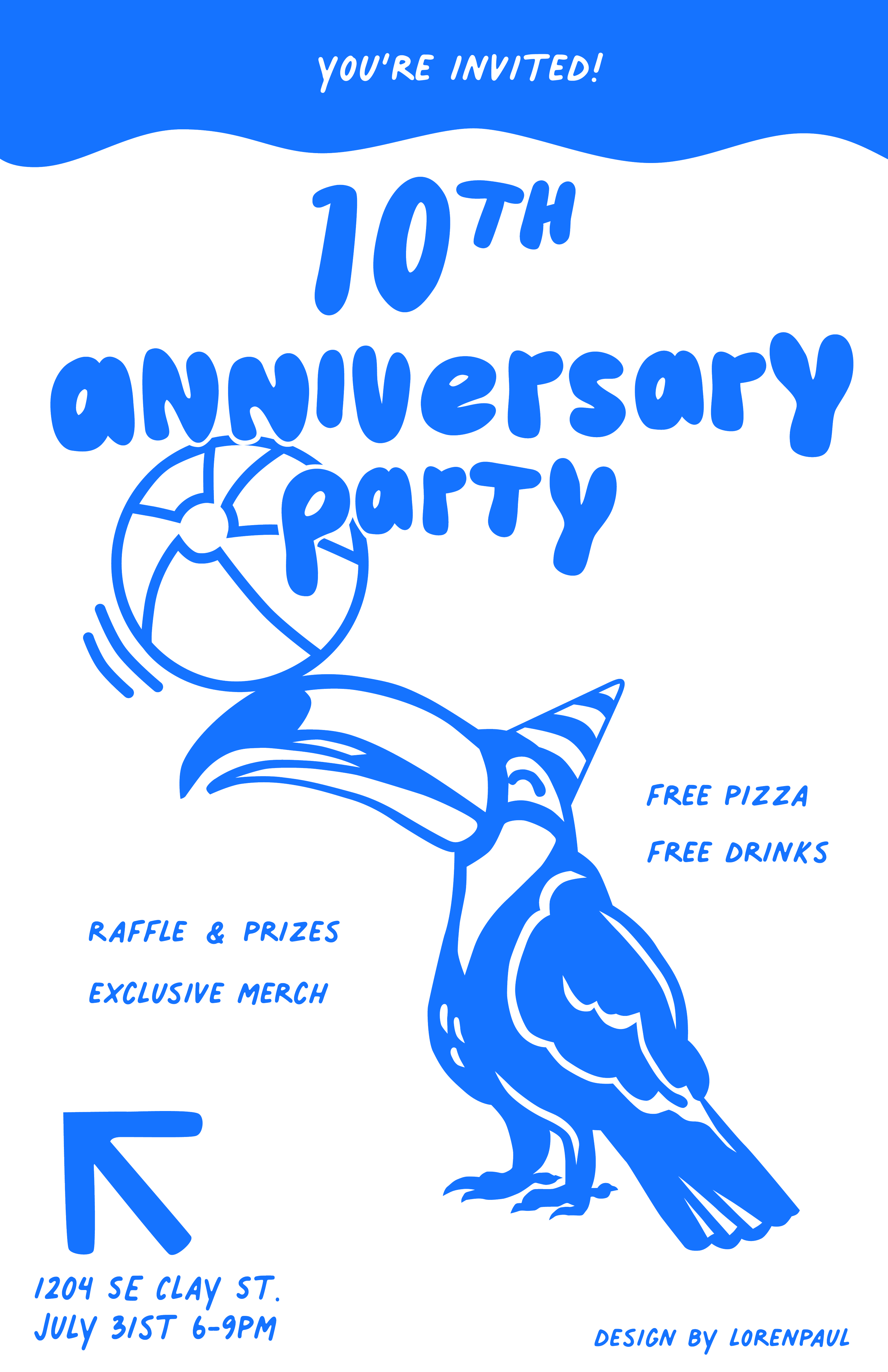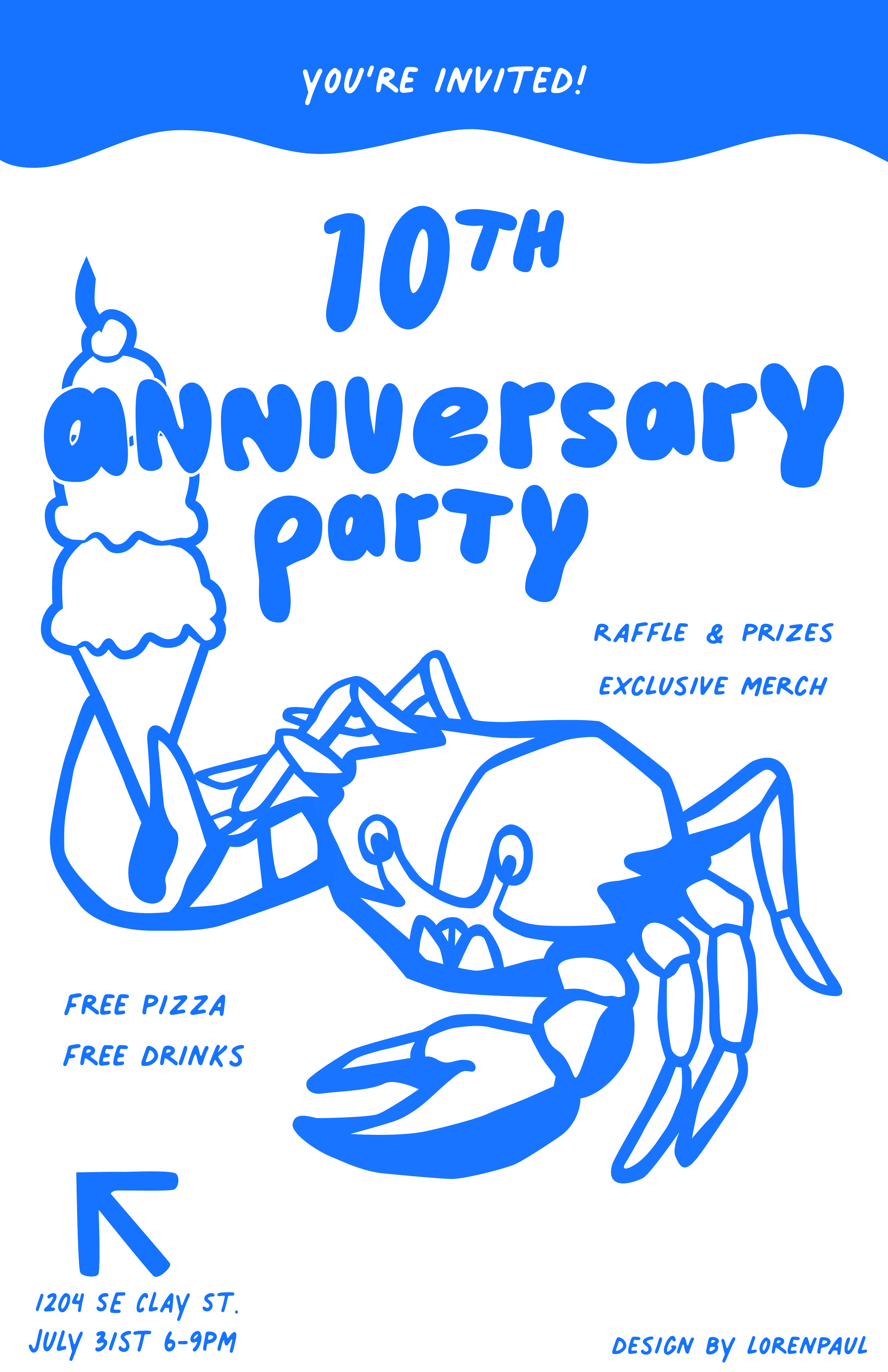 For the merchandising around the label release, I created custom sticker designs, T-shirt designs, and event posters and postcards for the 10th Anniversary Party.